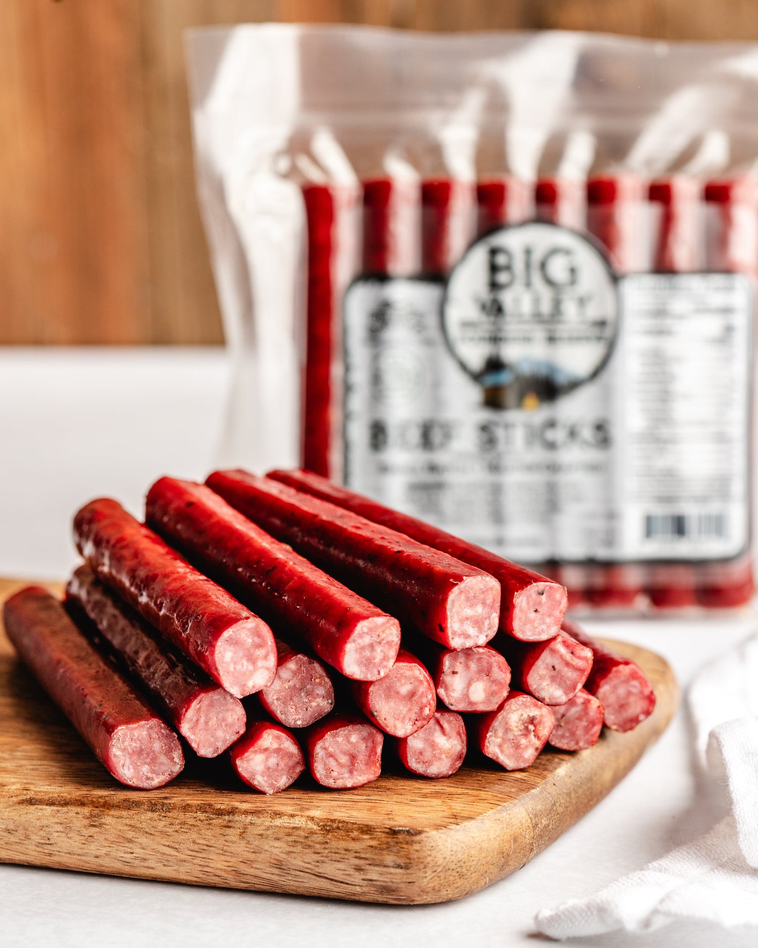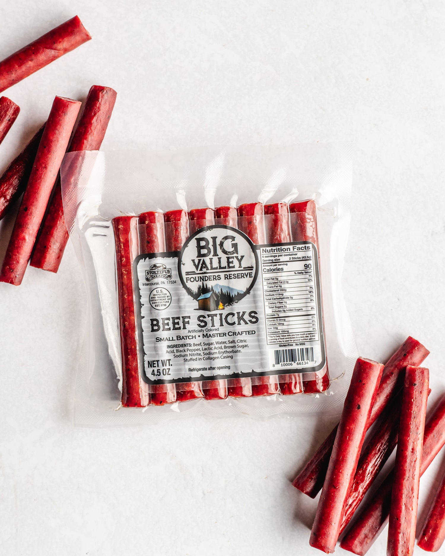 Introducing Big Valley Beef Sticks! Made with lean beef, black pepper, and brown sugar these delicious shelf-stable beef sticks are packed with protein and vitamins. Great for camping trips or a hike. Founder's Reserve and deep smoked for optimal flavor. 4.5 oz. in weight, 8 sticks per pack. Gluten Free. No MSG.