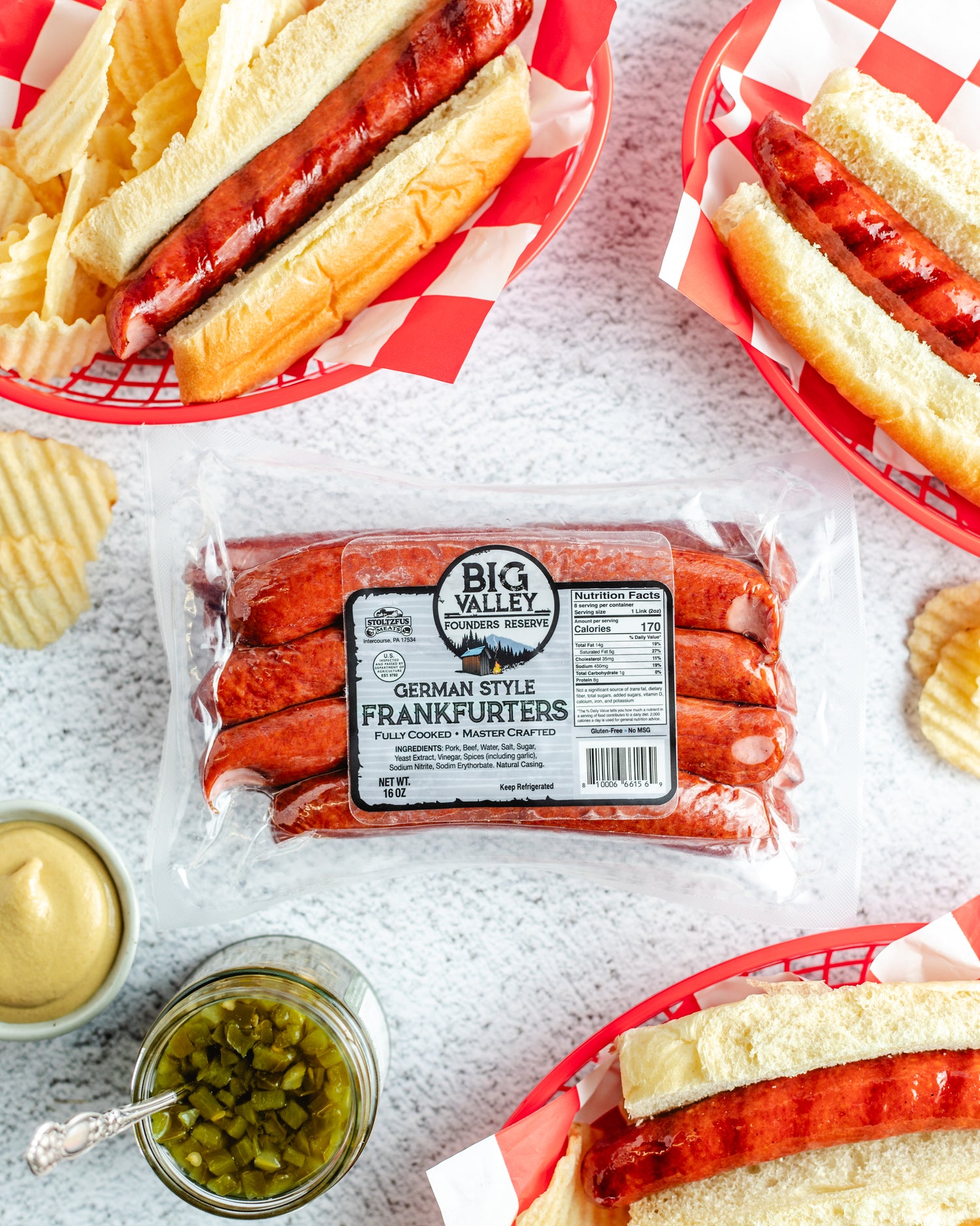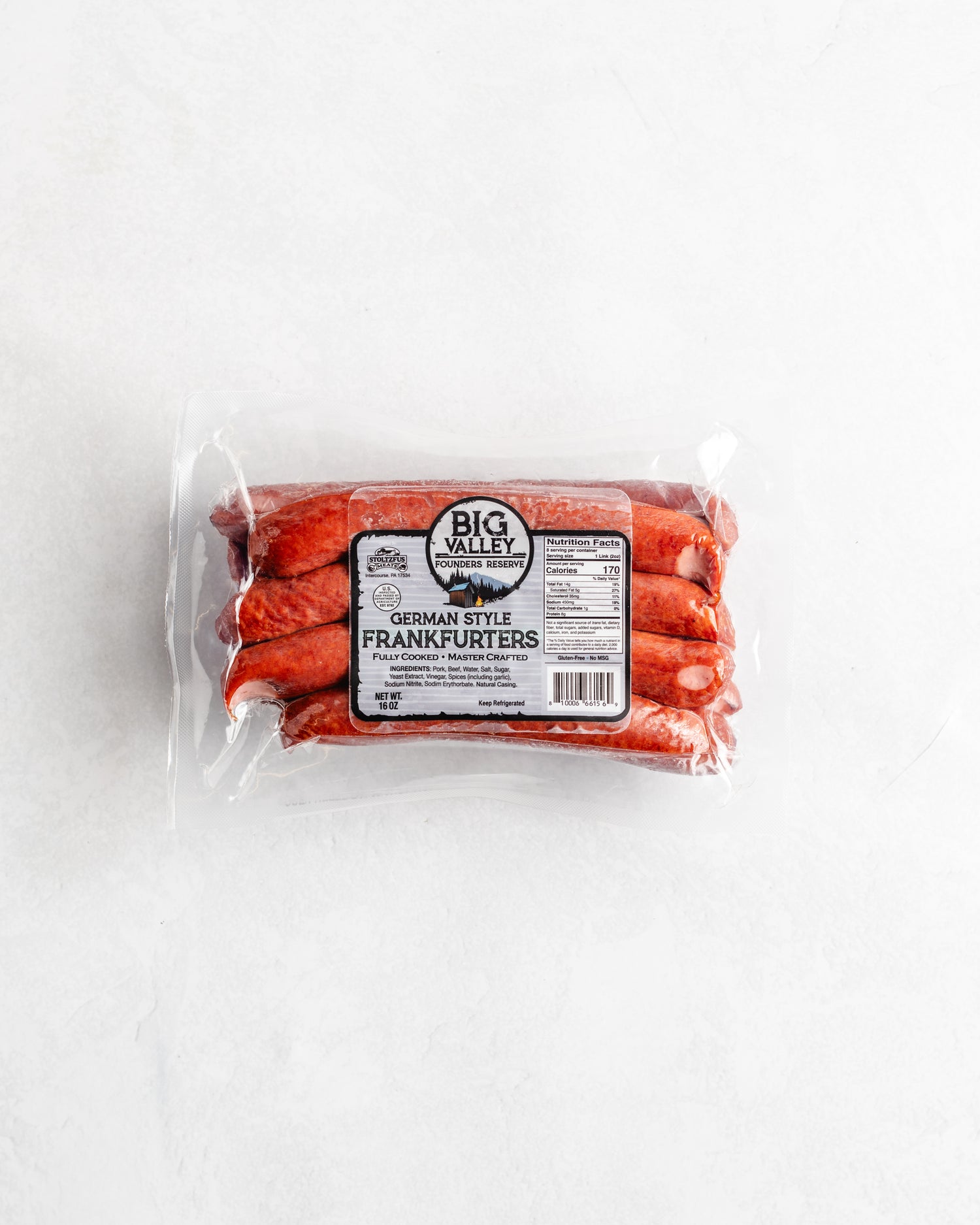 Crafted with premium cuts of beef and pork blended with old world spices, these German Style Frankfurters are a guaranteed grilling hit! Fine ground (but never emulsified!) and in a natural casing that has the SNAP! Whether boiled, grilled, or sauteed in butter, these franks are the real deal. 7 Frankfurters per pack. No MSG. Gluten-free.